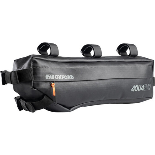 - Bolsa de cuadro Oxford Aqua Evo Adventure Frame, seis resistentes correas ajustables te permiten colocar la bolsa en cualquier parte del centro del cuadro. Construcción impermeable IPX6 mejora significativamente la capacidad de la bolsa para soportar fuertes lluvias e impactos de suciedad.